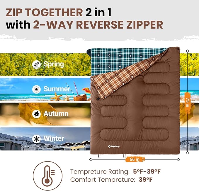 • MULTIFUNCTIONAL DESIGN-More Than Just a Sleeping Bag: This versatile sleeping bag offers more than just a place to sleep! The 2-way zippers allow you to zip two sleeping bags together for couples or family camping. Unzip the bottom for extra ventilation to cool your feet on warmer nights. Not only can it be used as a sleeping bag, but it can also be transformed into a blanket or picnic mat for family trips. Plus, it's machine washable, making cleaning a breeze for frequent use.