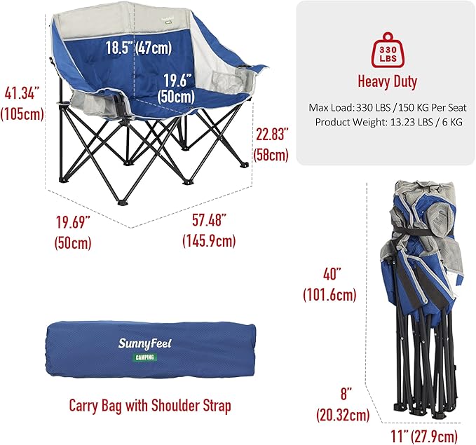 • Built to Last: The sturdy steel frame construction affords up to 300 LBS (136KG) weight capacity per camping loveseat and the chair weights 18 LBS (8.19KG). The double-seam 600x300D Oxford fabric & 200g mesh has great strength, durability and breathability.
