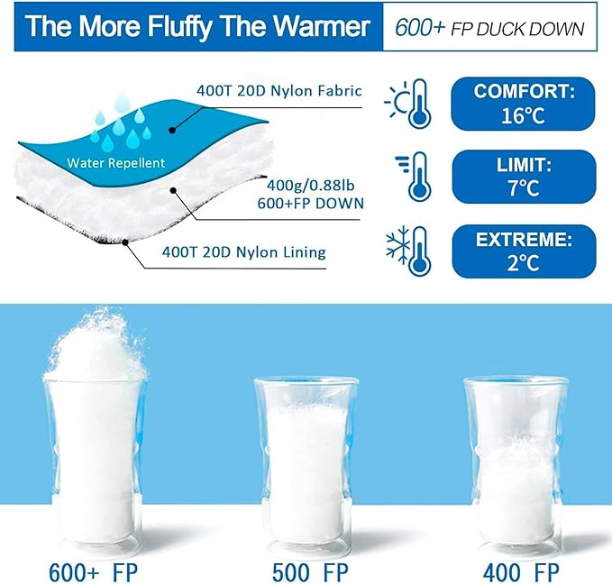 • 【 πŠπ„π„π π–π€π‘πŒ 】The adult sleeping bag is filled with 14.1oz selected duck down with 600 Fill Power, suitable for warm weather. Pure natural and healthy material, fluffy and soft, no odor or impurities. The sleeping bag specially adds a 1.6 " cloth strips for wind protection.Comfortable Temperature:37Β°F-59Β°F, Limited Temperature: 27Β°F.