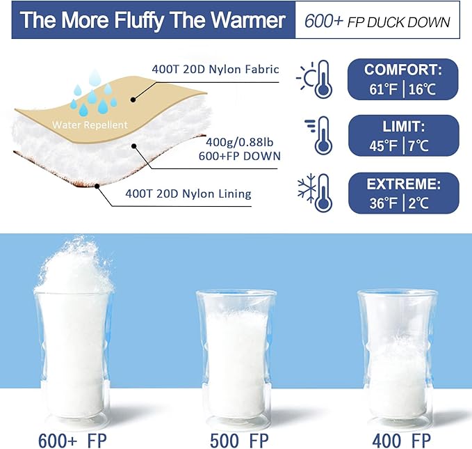 • 【 πŠπ„π„π π–π€π‘πŒ 】The adult sleeping bag is filled with 14.1oz selected duck down with 600 Fill Power, suitable for warm weather. Pure natural and healthy material, fluffy and soft, no odor or impurities. The sleeping bag specially adds a 1.6 " cloth strips for wind protection.Comfortable Temperature:45Β°F-61Β°F, Limited Temperature: 36Β°F.