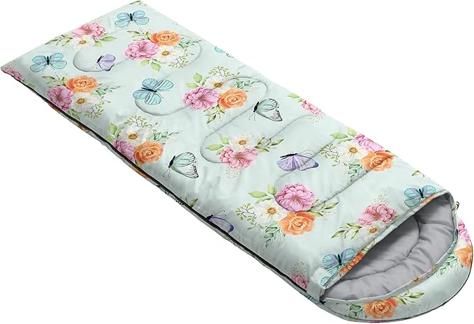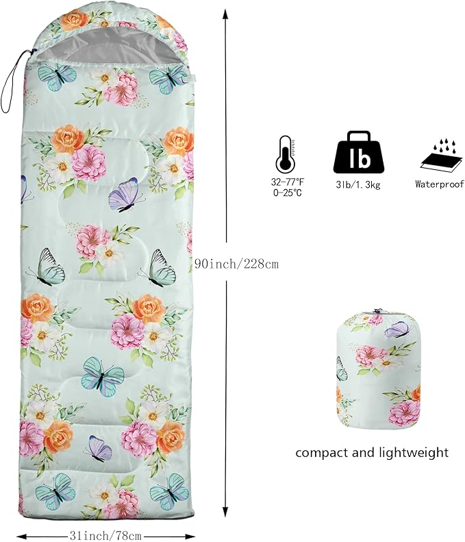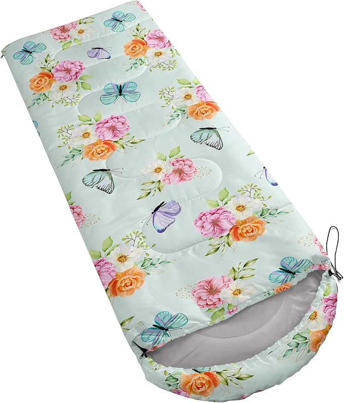 • A THOUGHT OUT DESIGN: Drawstring allows you to tighten hood and keep you warm. The idea of having a zipper at the foot to allow more warm or cool air to enter or exit the bag in different times of the season.Our Butterfly Flower sleeping bags are designed to provide much needed rest after a full day of outdoor activities.