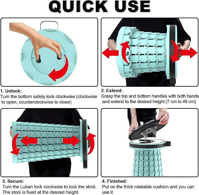 • 【SOFT & ROTATABLE CUSHION MORE COMFORTABLE】 Different from other stools, Our retractable stool additionally provides you with a soft and thick cushion, which is non-slip and rotatable, and makes you sit more comfortably. Goodbye to the traditional stiff stool, just get our collapsible stool and enjoy the recreation and entertainmen time.