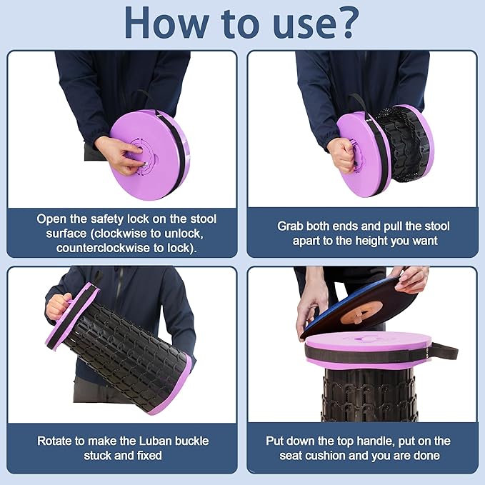 ALEVMOOM 2025 Upgraded XXL 19.7" Collapsible Stool with Cushion, 1000lbs Max Weight Heavy Duty Portable Telescoping Stool, Retractable Seat Folding Chair for Camping Fishing Hiking(Purple-XXL)