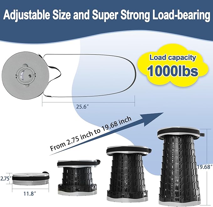 • 【More Stable and Durable,Maximum Load Capacity: 1000 lbs】Poor quality recycled materials may produce similar looking products, but the load-bearing capacity is no joke. This portable collapsible stool relies on patented structural design and special high-performance new materials. It weighs only 3.5 lbs, but can bear 1,000 lbs, the highest load-bearing capacity across the whole network, bringing safety and stability while maintaining the lightness of the telescopic folding stool.