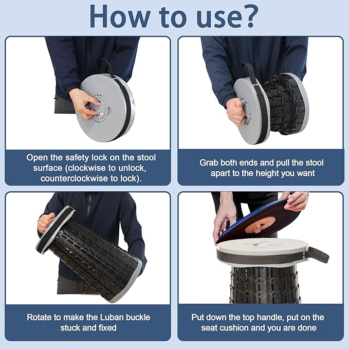 • 【Adjustable height, portable and convenient】This outdoor portable collapsible stool can be adjusted from 2.75 inches to 19.7 inches in height, whether it is an adult, an elderly or a child, you can find the height that suits you, the folded size is compact and easy to carry, just grab the handle with both hands and rotate it in opposite directions, it can be easily opened and folded.
