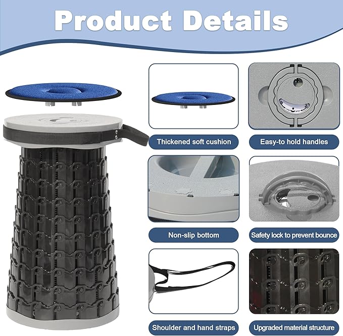 ALEVMOOM 2025 Upgraded XXL 19.7" Collapsible Stool with Cushion, 1000lbs Max Weight Heavy Duty Portable Telescoping Stool, Retractable Seat Folding Chair for Camping Fishing Hiking(Grey-XXL)