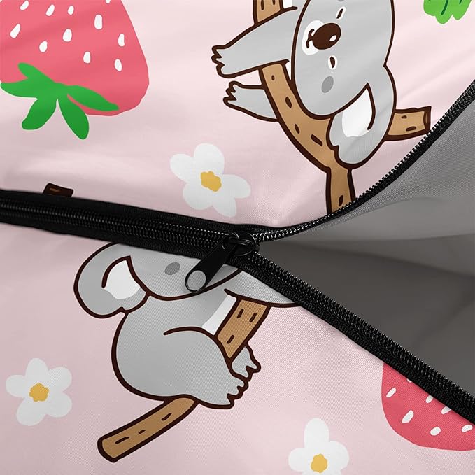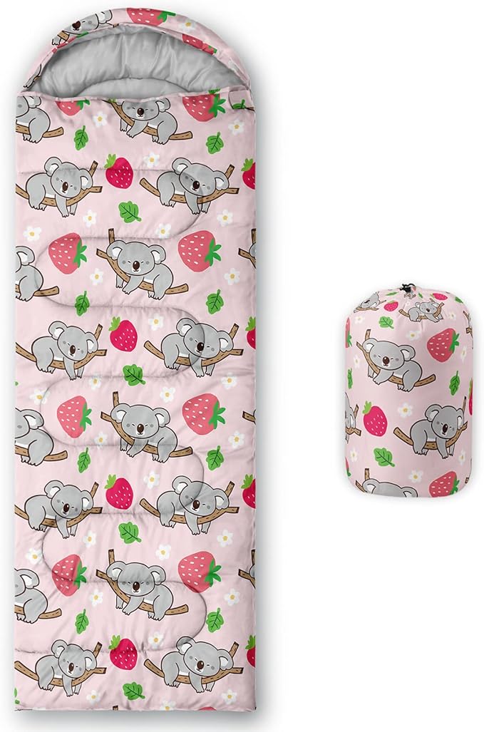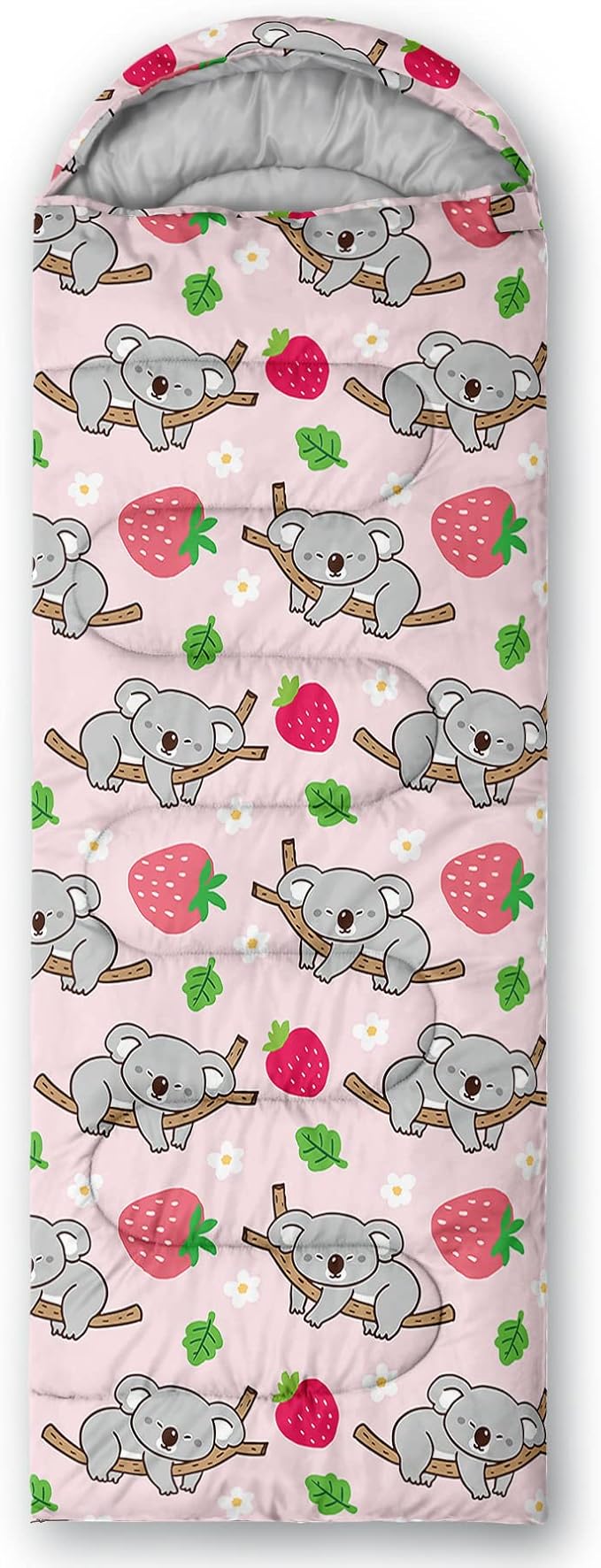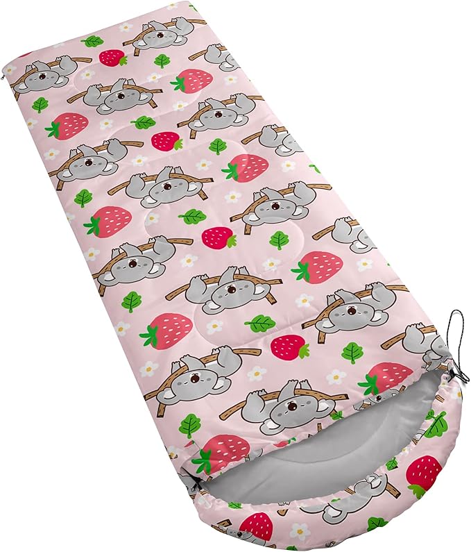 • A THOUGHT OUT DESIGN: Drawstring allows you to tighten hood and keep you warm. The idea of having a zipper at the foot to allow more warm or cool air to enter or exit the bag in different times of the season.Our Cute Strawberry Koala sleeping bags are designed to provide much needed rest after a full day of outdoor activities.