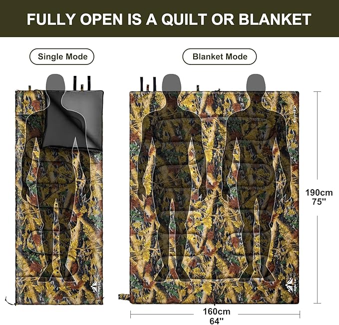 • 【Switched to be a Quilt or Blanket】Spreading the sleeping bag via the double-side zipper and it will be switched to a pretty wide quilt of 5.2x6.3ft. The zipper on the bottom offers better ventilation for your feet
