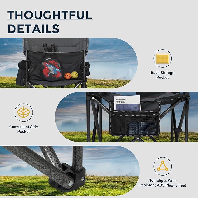 • 【Effective Fatigue Relief】The comfortable camping chair is designed with a fully padded backrest and armrests, conforming to ergonomic principles to provide ultimate comfort. You can sit in it for extended periods without any discomfort, whether you're at the beach, camping, at home, or in the garden, this collapsible camping chair will help you experience the desired comfort and relaxation.
