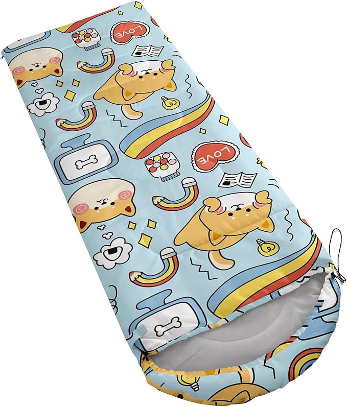 • SUITABLE:The sleeping bag can be used for 3 Seasons.SIZE:80*230cm Suggenal extreme temperature: 41 ℉ -77 ℉.Applicable in a variety of scenarios,such as Travel camping pajamas party,It's very suitable for you to travel with your children.Half-circle hood with adjustable drawstring,which can keep you warm and prevent your humidity