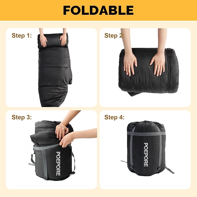• More Spacious: POEPORE sleeping bag has dimensions of (78.74+11.81)*35.43 inches and a packed size of 16.53*13.38*5.51 inches. The sleeping bag features an enlarged and widened design, providing ample space that suits various body types, including even XXL sizes, allowing freedom of movement and ensuring comfort.