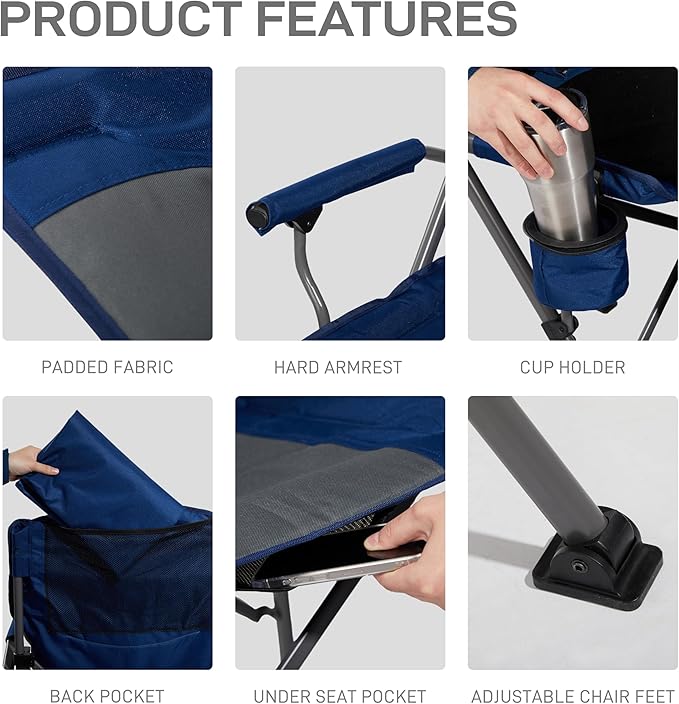 • SPECIFICATIONS: Set up size of the tall camping chair is 25.8" W x 29.7"L x 49.0" H, seat height is 31", and folding size is 50" H x 11.4" L x 8.7" W; supports up to 300 lbs,weight is 14.8lbs