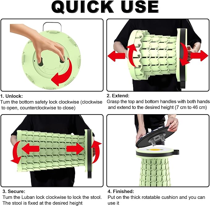 • 【WIDE APPLICATION & SERVICE】Portable camping stool is very suitable for indoor outdoor, such as living room, bedroom, office, camping, travel, fishing, leisure, grilling, gardening, etc. The beauty, functionality, durability and portability of telescoping stool make it a best choice for friends and family for holidays or any occasions. If you have any problems during use, please contact us anytime and we will reply within 24 hours.