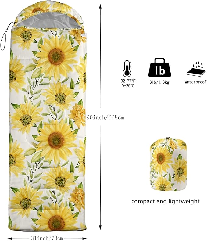 • 🌈【Fashion Design】SIZE - 31 by 90 inches (W x D). Our sleeping bag can be used in 3 seasons with a design temperature of 32℉-77℉(0℃-25℃). These bags also have a weather resistant waterproof design to keep you warm and prevent you from any dampness.
