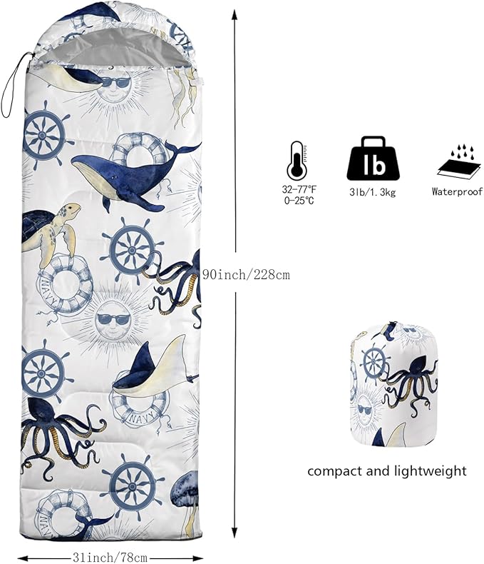• 🌈【Fashion Design】SIZE - 31 by 90 inches (W x D). Our sleeping bag can be used in 3 seasons with a design temperature of 32℉-77℉(0℃-25℃). These bags also have a weather resistant waterproof design to keep you warm and prevent you from any dampness.