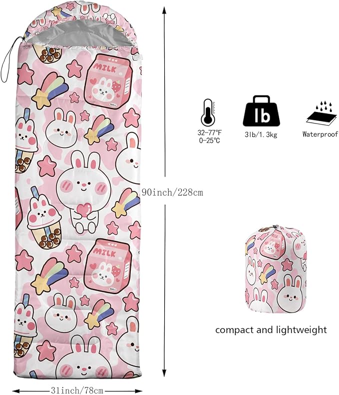 • 🌈【Fashion Design】SIZE - 31 by 90 inches (W x D). Our sleeping bag can be used in 3 seasons with a design temperature of 32℉-77℉(0℃-25℃). These bags also have a weather resistant waterproof design to keep you warm and prevent you from any dampness.