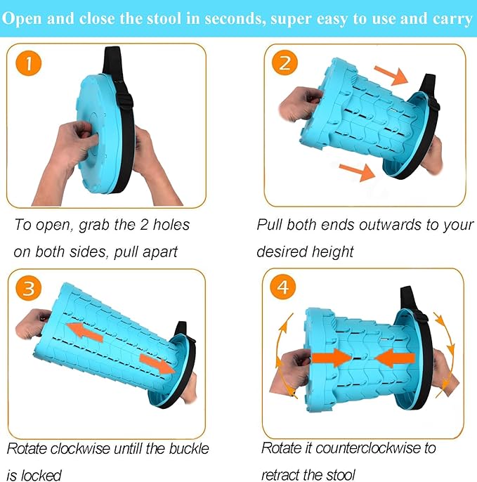 • [Easy to Use, Multipurpose]: Super easy to use. You can open the collapsible stool by holding both ends and pulling to open with slight turning them, perfect for indoors and outdoors. Indoor occasions such as the living room, bedroom, bathroom, kitchen, office. Outdoor activities: drawing room, garden, hiking, BBQ, camping, queue, fishing, etc