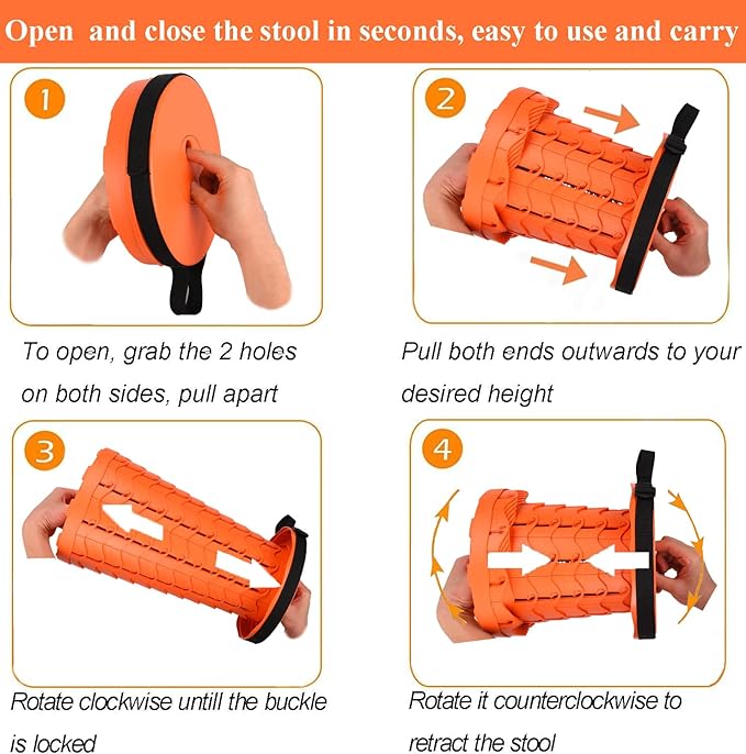 • [Easy to use,Multipurpose]:super easy to use.You can open the collapsible stool by holding both ends and pulling to open with slight turning them,perfect for indoors and outdoors.Indoor occasions such as the living room, bedroom,bathroom,kitchen,office.Outdoor activities:drawing room,garden,hiking,BBQ,camping,queue,fishing, kitchen, etc