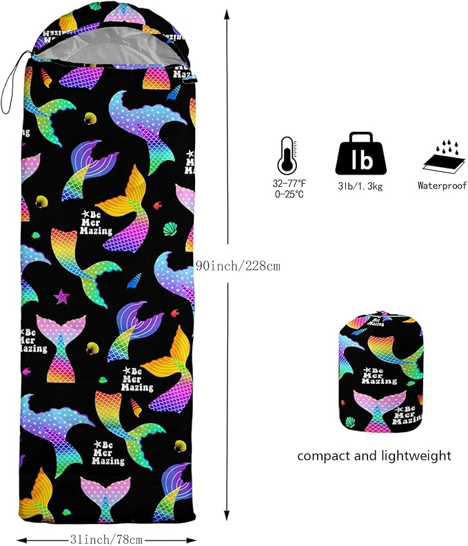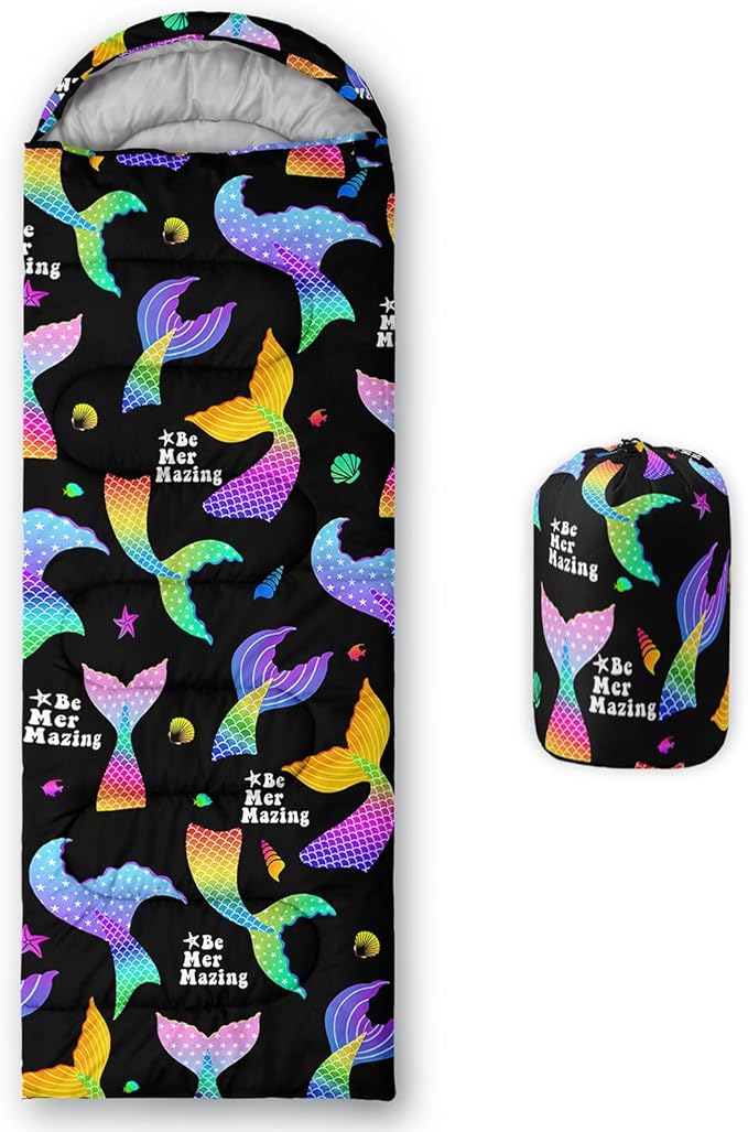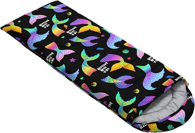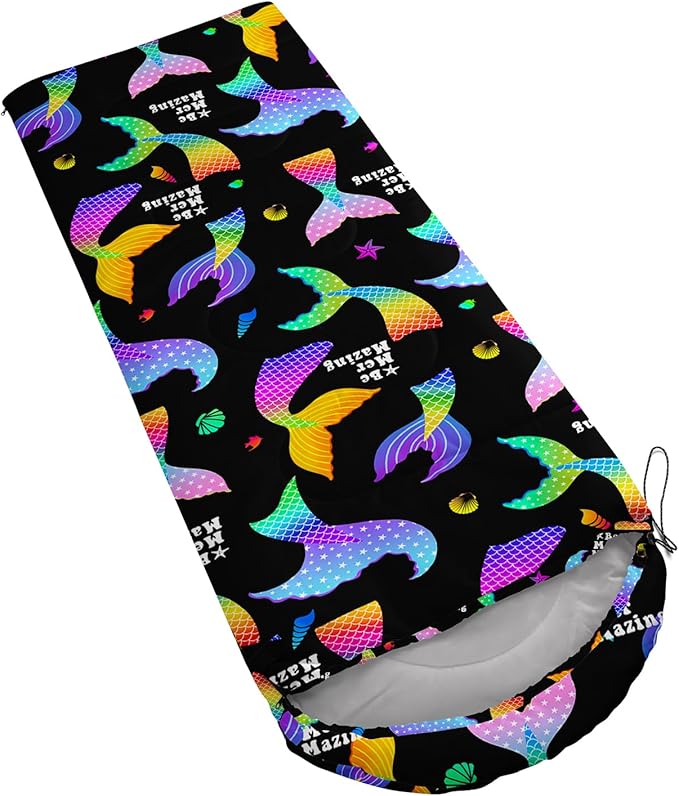 • A THOUGHT OUT DESIGN: Drawstring allows you to tighten hood and keep you warm. The idea of having a zipper at the foot to allow more warm or cool air to enter or exit the bag in different times of the season.Our Mermaid Shell sleeping bags are designed to provide much needed rest after a full day of outdoor activities.