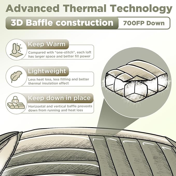 • 23 Degree Fahrenheit (-5℃): Stay warm even in cold temperatures with 2KG high-quality white duck down. The down fill provides exceptional insulation, keeping you cozy and comfortable during cold weather camping trips