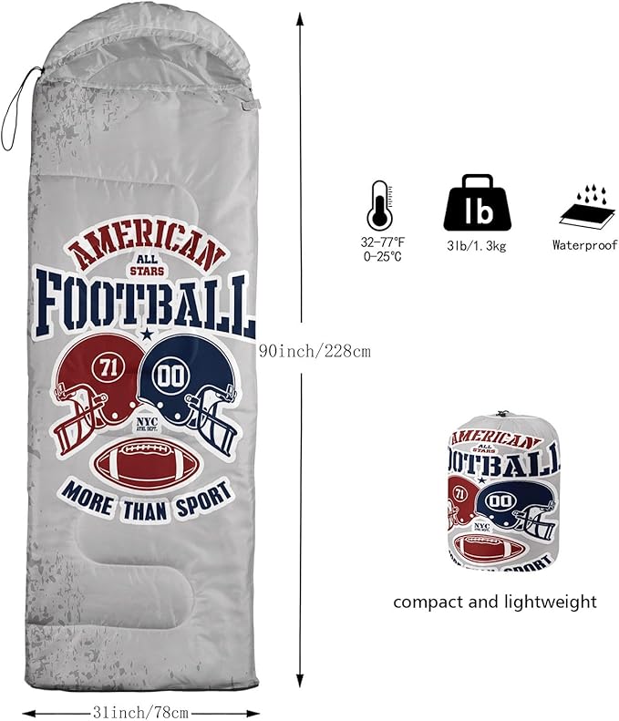 • SUITABLE:The sleeping bag can be used for 3 Seasons.SIZE:90.5"L x 31.5"W Suggenal extreme temperature: 41 ℉ -77 ℉.Applicable in a variety of scenarios,such as Travel camping pajamas party,It's very suitable for you to travel with your children.Half-circle hood with adjustable drawstring,which can keep you warm and prevent your humidity