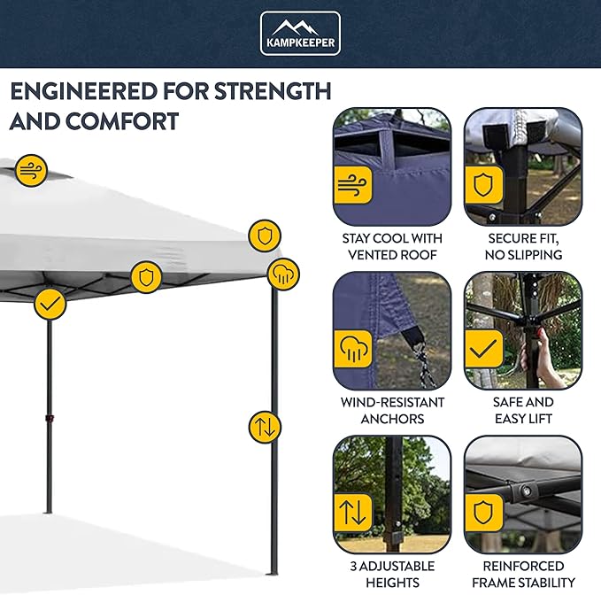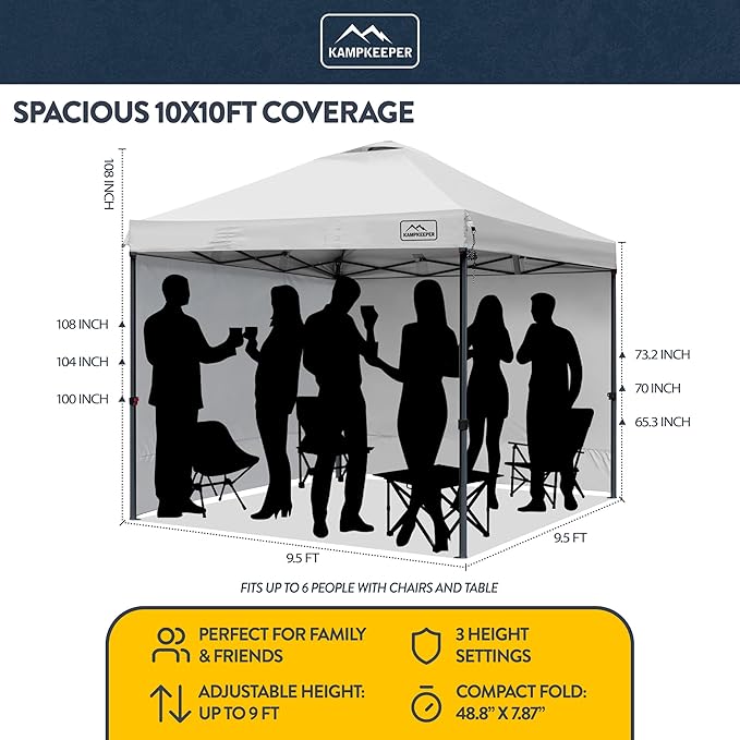 KAMPKEEPER 10x10 Pop Up Canopy Tent with 2 Sidewalls - Waterproof Outdoor Shelter for Sun Shade, Camping, Beach, Patio and Backyard Events, White