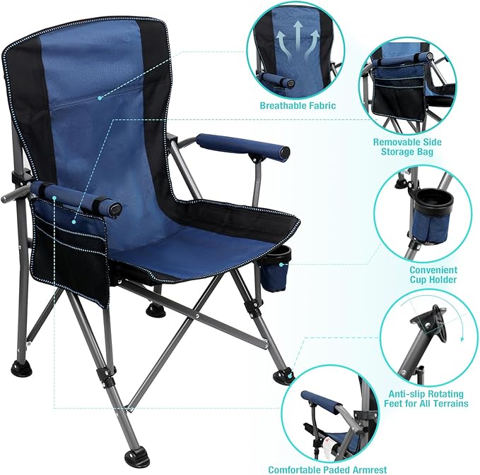 Camping Chair for Adults Heavy Duty Outdoor Patio Lawn Chairs Portable Support 350 LBS High Back Padded Oxford with Armrests, Storage Bag, Cup Holder, for Outside Fishing, Camping, Foldable