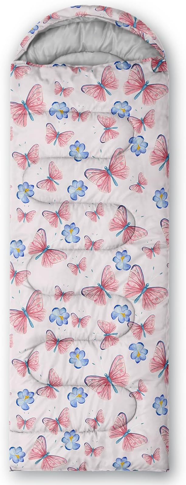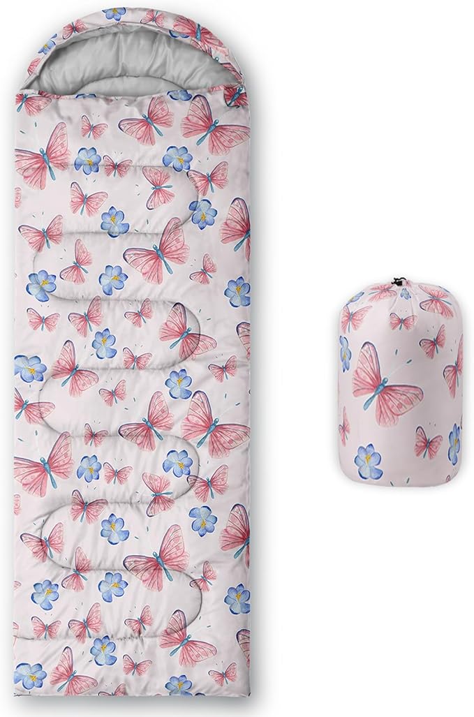 • 【Fits For 3 Seasons】: Size - 31 by 90 inches (W x D). Our Pink Butterfly sleeping bag can be used in 3 seasons with a design temperature of 32℉-77℉(0℃-25℃). These Blue Flower bags also have a weather resistant waterproof design to keep you warm and prevent you from any dampness.