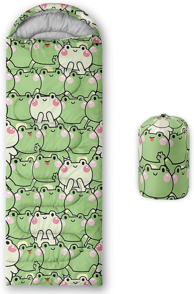 • 【Fits For 3 Seasons】: Size - 31 by 90 inches (W x D). Our Cartoon Frog sleeping bag can be used in 3 seasons with a design temperature of 32℉-77℉(0℃-25℃). These Green Frog bags also have a weather resistant waterproof design to keep you warm and prevent you from any dampness.