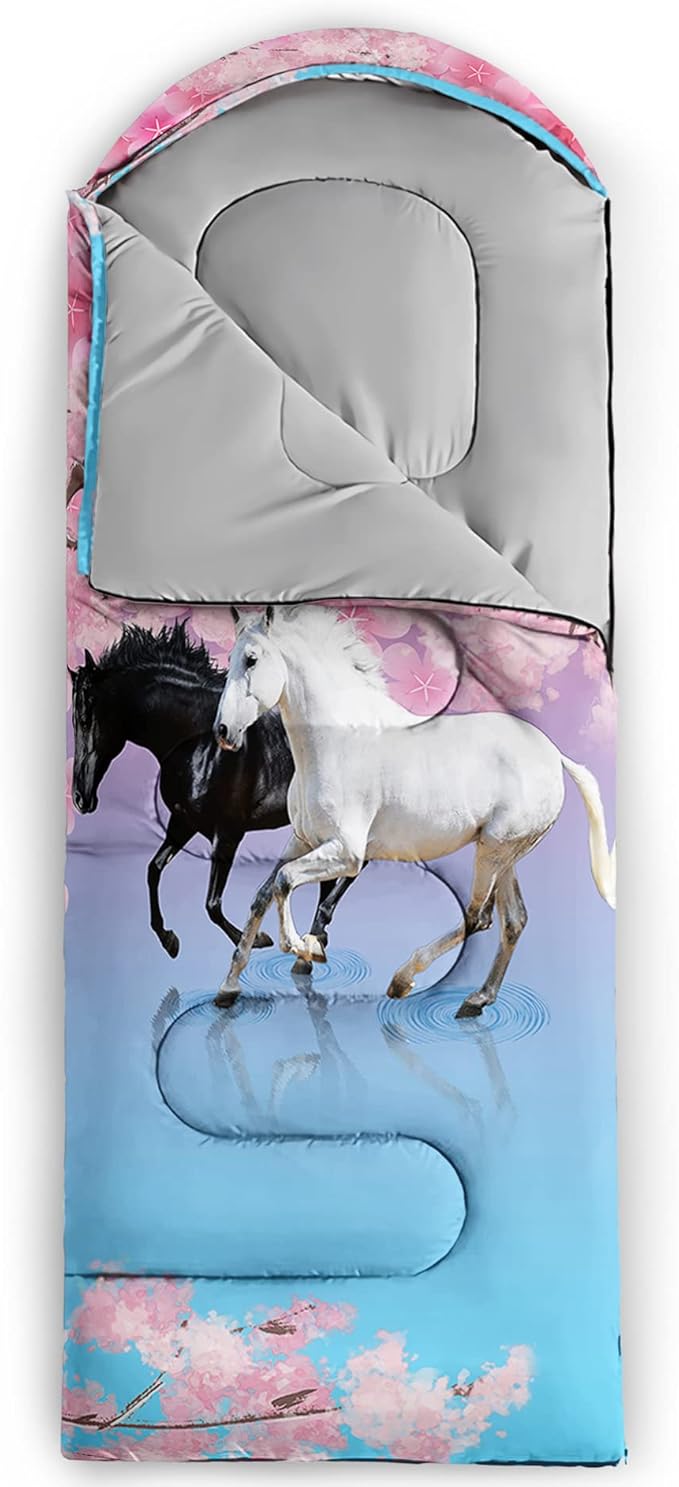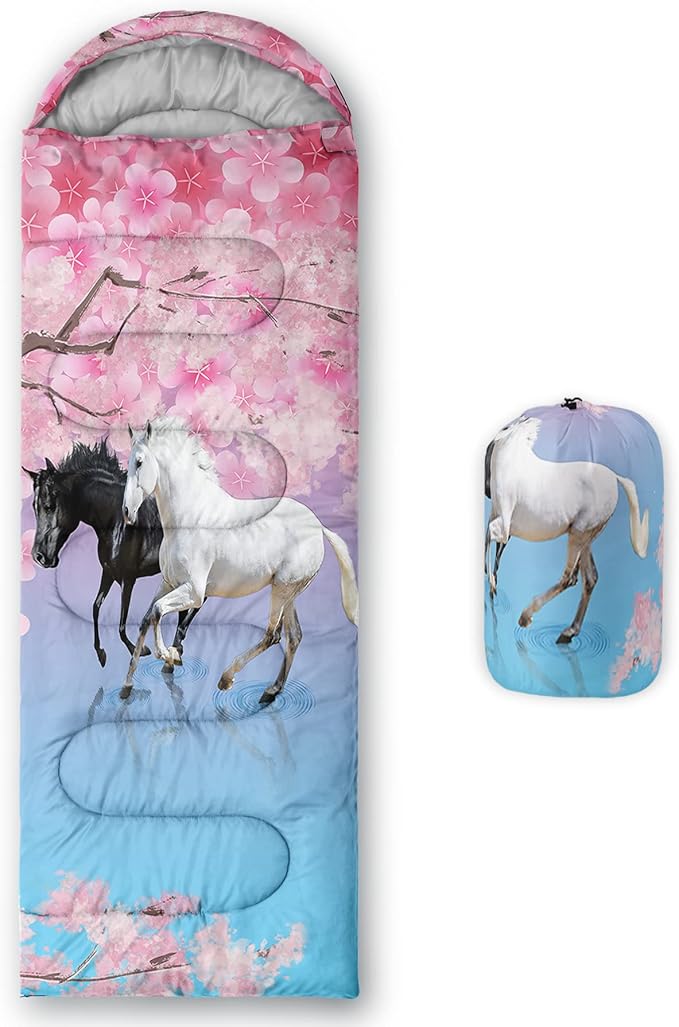 • 【Fits For 3 Seasons】: Size - 31 by 90 inches (W x D). Our Pink cherry blossoms sleeping bag can be used in 3 seasons with a design temperature of 32℉-77℉(0℃-25℃). These 3D Horse bags also have a weather resistant waterproof design to keep you warm and prevent you from any dampness.
