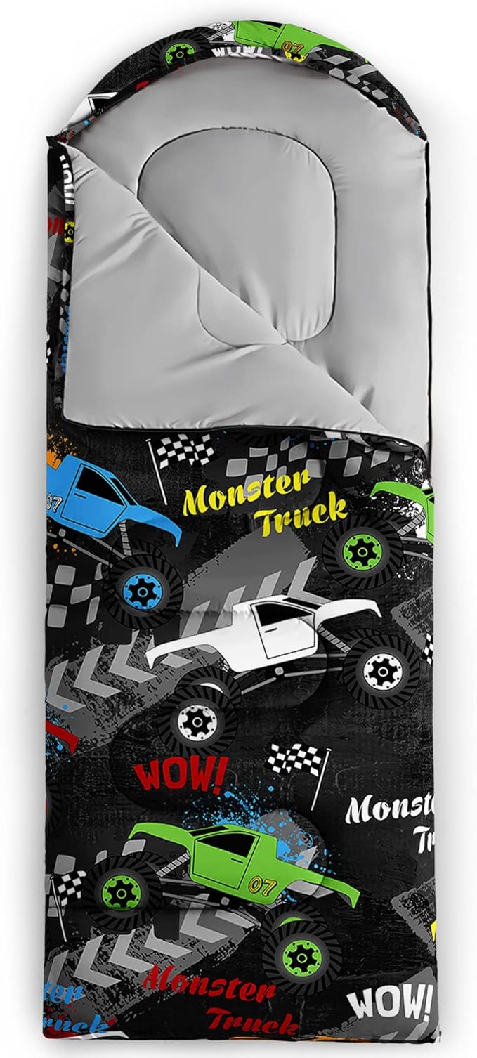 • 【Fits For 3 Seasons】: Size - 31 by 90 inches (W x D). Our Race truck sleeping bag can be used in 3 seasons with a design temperature of 32℉-77℉(0℃-25℃). These Cartoon Car bags also have a weather resistant waterproof design to keep you warm and prevent you from any dampness.
