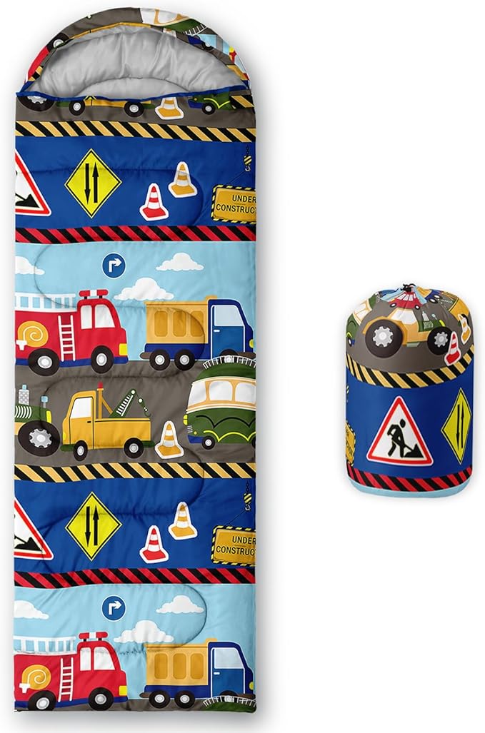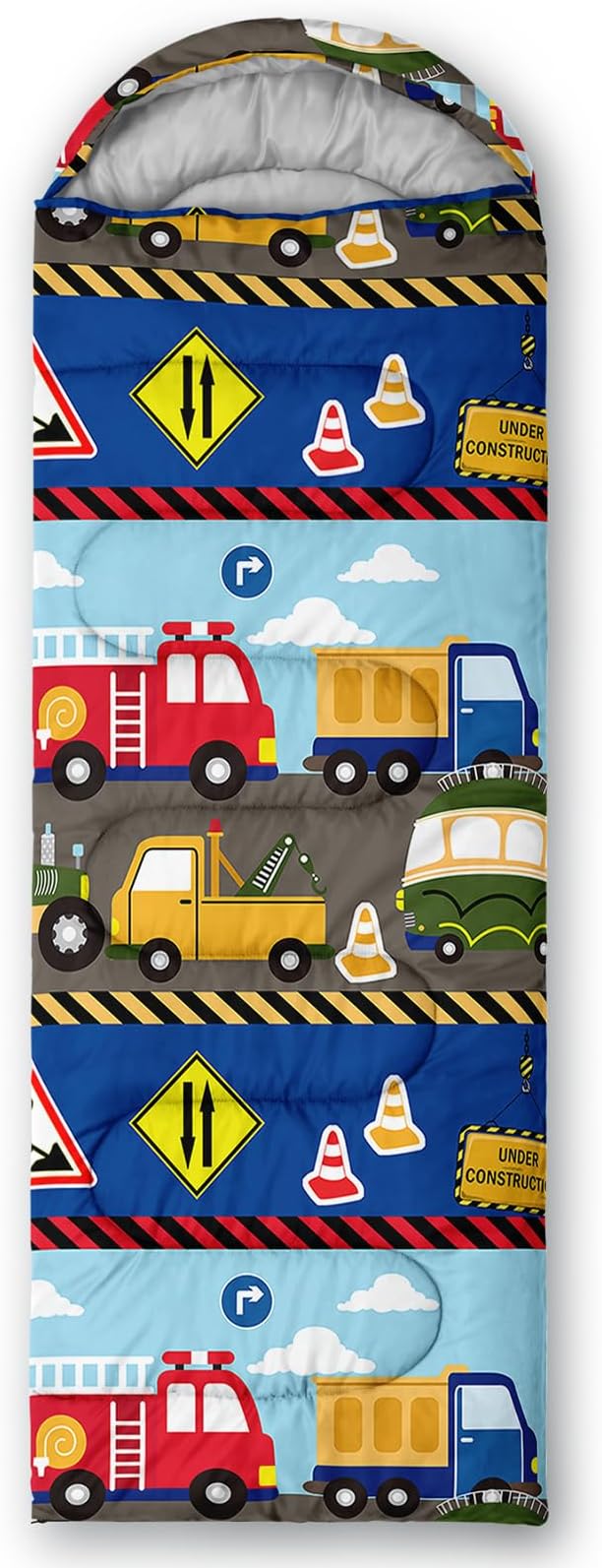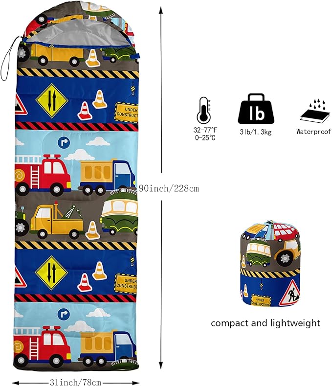 • 【Fits For 3 Seasons】: Size - 31 by 90 inches (W x D). Our Construction Zone sleeping bag can be used in 3 seasons with a design temperature of 32℉-77℉(0℃-25℃). These Traffic Vehicles bags also have a weather resistant waterproof design to keep you warm and prevent you from any dampness.