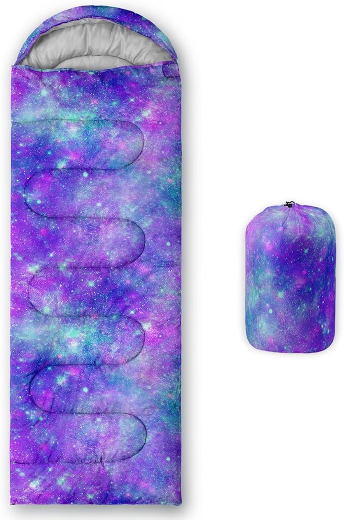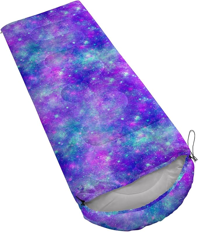 • 【Fits For 3 Seasons】: Size - 31 by 90 inches (W x D). Our Purple Tie-Dye sleeping bag can be used in 3 seasons with a design temperature of 32℉-77℉(0℃-25℃). These Blue Shining Star bags also have a weather resistant waterproof design to keep you warm and prevent you from any dampness.