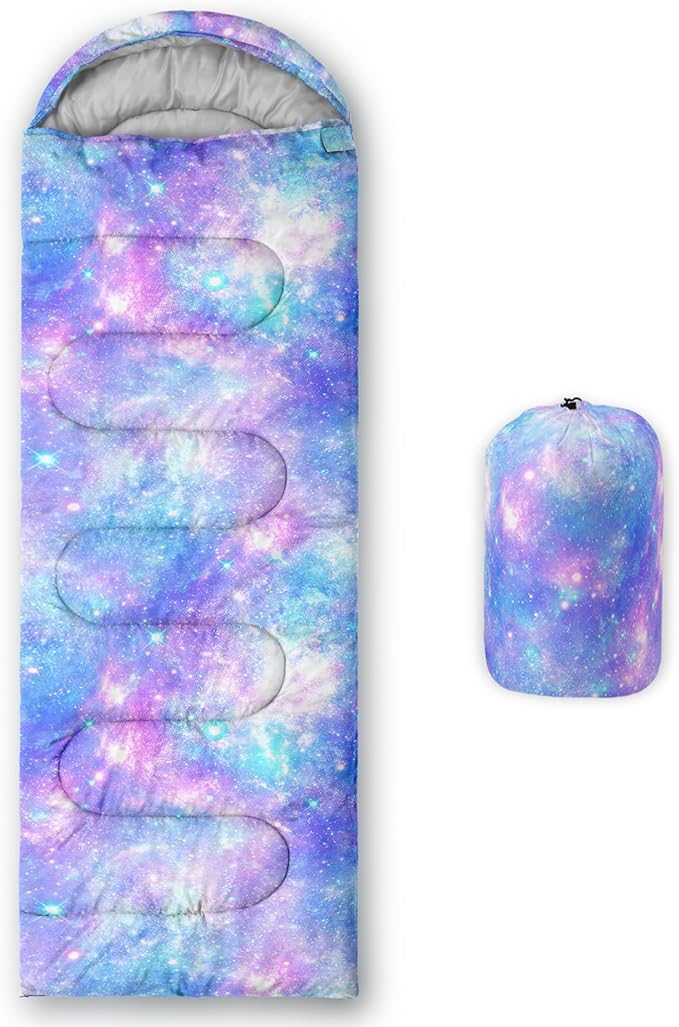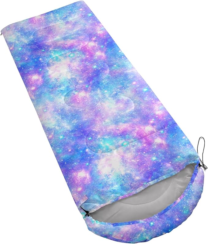 • 【Fits For 3 Seasons】: Size - 31 by 90 inches (W x D). Our Shining Star sleeping bag can be used in 3 seasons with a design temperature of 32℉-77℉(0℃-25℃). These Blue Purple Starry Sky bags also have a weather resistant waterproof design to keep you warm and prevent you from any dampness.