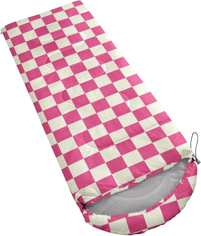 • Pink and White Check sleeping bags For All Seasons- Our camping sleeping bags are designed to give you a good night's sleep. Ideal for spring,summer,fall,and winter,rated from 32°F to 77°F (optimal comfort temperature is 50°F to 65°F). Stay comfortable and warm in any condition at normal altitude. Can be used for any outdoor adventure,class camping,summer camps,couch surfing,indoor blanket,and as an emergency blanket for vehicles.