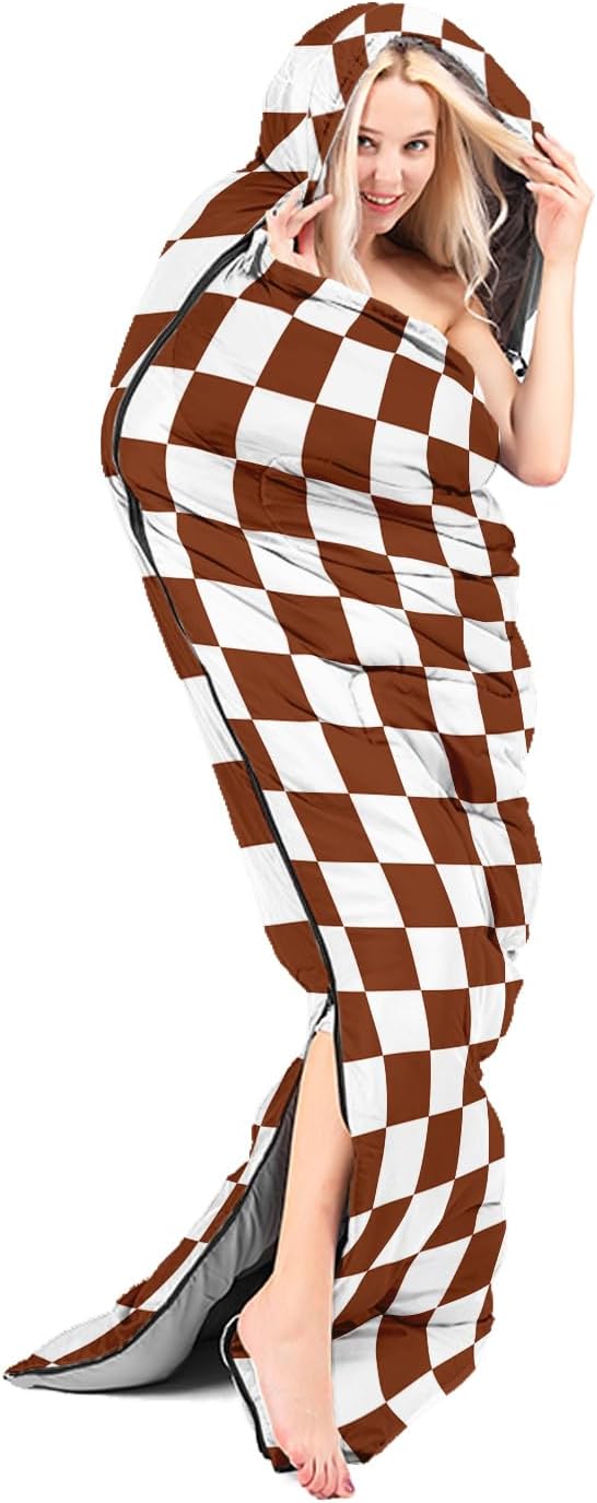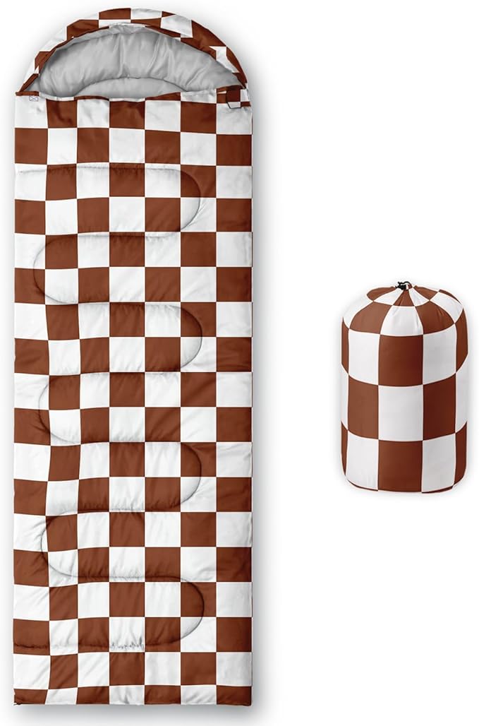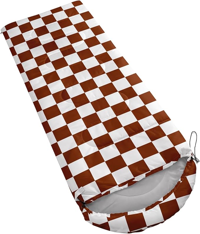 • Brown and White Check sleeping bags For All Seasons- Our camping sleeping bags are designed to give you a good night's sleep. Ideal for spring,summer,fall,and winter,rated from 32°F to 77°F (optimal comfort temperature is 50°F to 65°F). Stay comfortable and warm in any condition at normal altitude. Can be used for any outdoor adventure,class camping,summer camps,couch surfing,indoor blanket,and as an emergency blanket for vehicles.