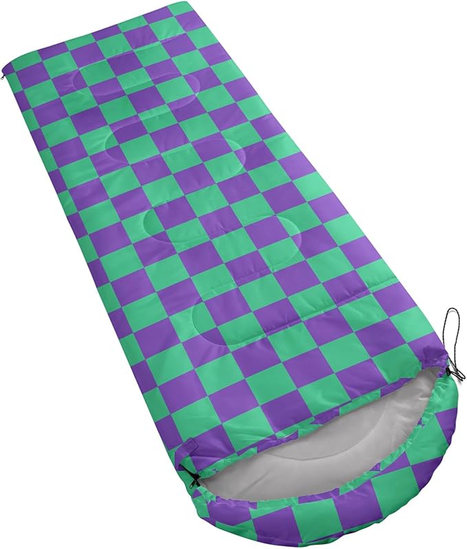 • Purplr and Green Check sleeping bags For All Seasons- Our camping sleeping bags are designed to give you a good night's sleep. Ideal for spring,summer,fall,and winter,rated from 32°F to 77°F (optimal comfort temperature is 50°F to 65°F). Stay comfortable and warm in any condition at normal altitude. Can be used for any outdoor adventure,class camping,summer camps,couch surfing,indoor blanket,and as an emergency blanket for vehicles.