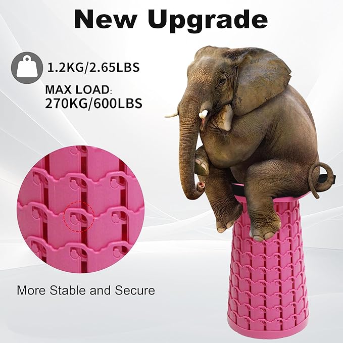 • 【More Safaty and More Sturdy&More Height 】 Made of high-strength heavy duty environmental material plastic PP, the cylinder shape structure, tight connecting clasps, and the non-slip base ensure that this collapsable stool will give the stability to provide safe and comfortable sitting.The max load capacity is as much as 600 Lbs(270kg),Stool Height 46cm(18.1")ATTENTION:Please sit in the center of the seat.DO NOT sit on the edge of the seat.DO NOT tilt the stool.not sweep down!