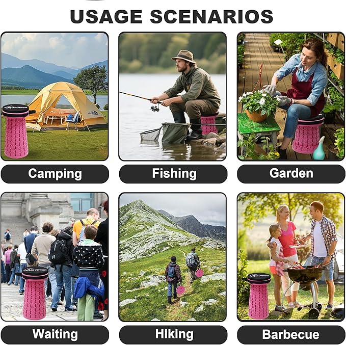• 【Wide-Application】 The camping stools is perfect for indoors and outdoors. Indoor occasions such as the living room, bedroom, bathroom, mountain, kitchen, beach, pool, office; Outdoor activities like camping, mountain, fishing, hunting, hiking, BBQ, picnic, queuing, gardening, golf. Notice: More Sturdy and More Height Telescoping Stool with Cushion you will like it!