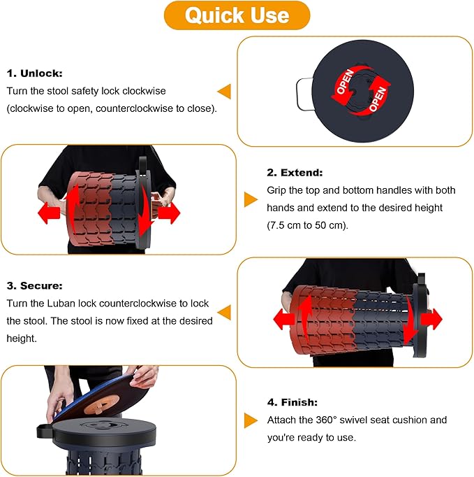 • 【Soft And Rotatable Seat Cushion】Unlike other stools, our portable stool has an additional layer of soft and high-quality seat cushions that can rotate. A comfortable seat cushion has been added with an elastic band, which can be well integrated with the telescopic stool and is not easy to fall off. Pick up our comfortable foldable stool and enjoy a wonderful time.