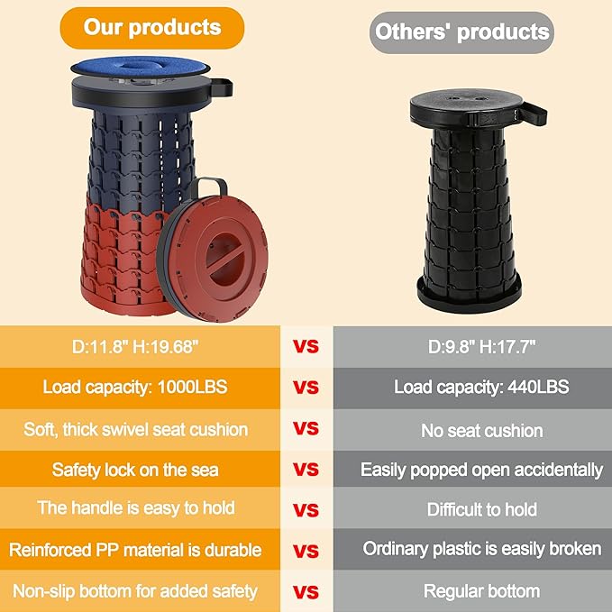 • 【Wider and More Comfortable】The collapsible stool has been upgraded and its width has been improved from 9.8 inch to 11.8 inch, providing a larger contact area for users to sit on, making it more comfortable. We have summarized the phenomenon of folding stools being prone to breakage, and we have thickened and widened the stools, increasing their load-bearing capacity to 1000 pounds.
