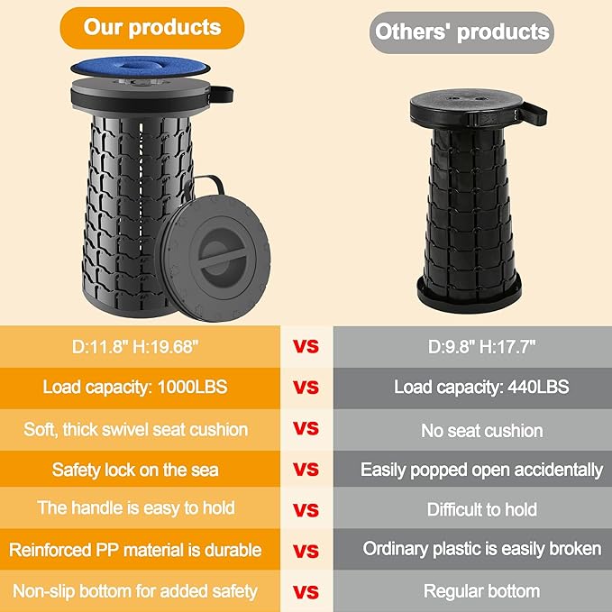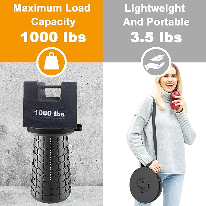 • 【Wider and More Comfortable】The collapsible stool has been upgraded and its width has been improved from 9.8 inch to 11.8 inch, providing a larger contact area for users to sit on, making it more comfortable. We have summarized the phenomenon of folding stools being prone to breakage, and we have thickened and widened the stools, increasing their load-bearing capacity to 1000 pounds.