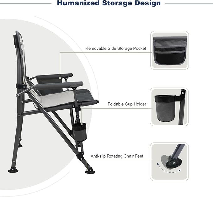 • Convenient Chair: The breathable mesh back keeps you cool in hot weather. It features a side pocket and a cup holder for convenience. Rotating feet on each leg provide adjustability for uneven surfaces.