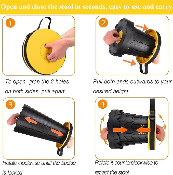 • [Easy to Use, Multipurpose]: Super easy to use. You can open the collapsible stool by holding both ends and pulling to open with slight turning them, perfect for indoors and outdoors. Indoor occasions such as the living room, bedroom, bathroom, kitchen, office. Outdoor activities: drawing room, garden, hiking, BBQ, camping, queue, fishing, etc