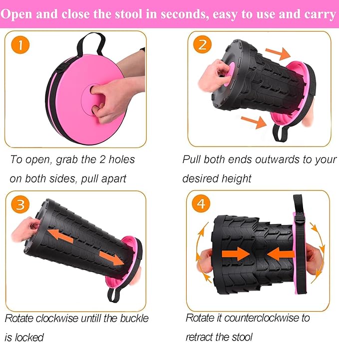 • [Easy to Use, Multipurpose]: Super easy to use. You can open the collapsible stool by holding both ends and pulling to open with slight turning them, perfect for indoors and outdoors. Indoor occasions such as the living room, bedroom, bathroom, kitchen, office. Outdoor activities: drawing room, garden, hiking, BBQ, camping, queue, fishing, etc