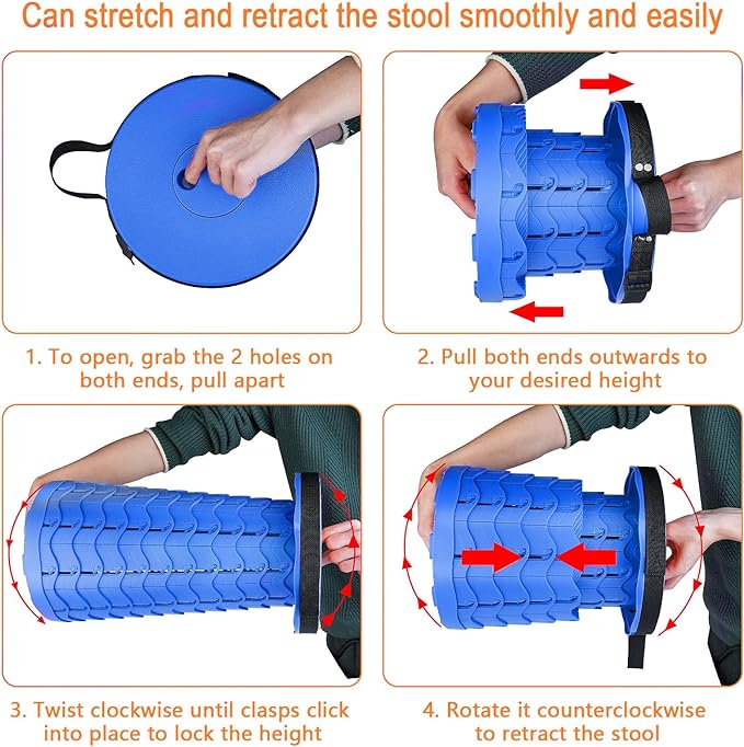• PORTABLE & LIGHTWEIGHT: This telescopic stool is only 2.54 pounds with dimeter 9.84 inches/250mm. The adjustable strap makes the stool easy to carry in your hand or hanging on your shoulder. Perfect to use for camping, fishing, hiking, hunting, picnic, BBQ. Also can be used in living room, bedroom, bathroom etc