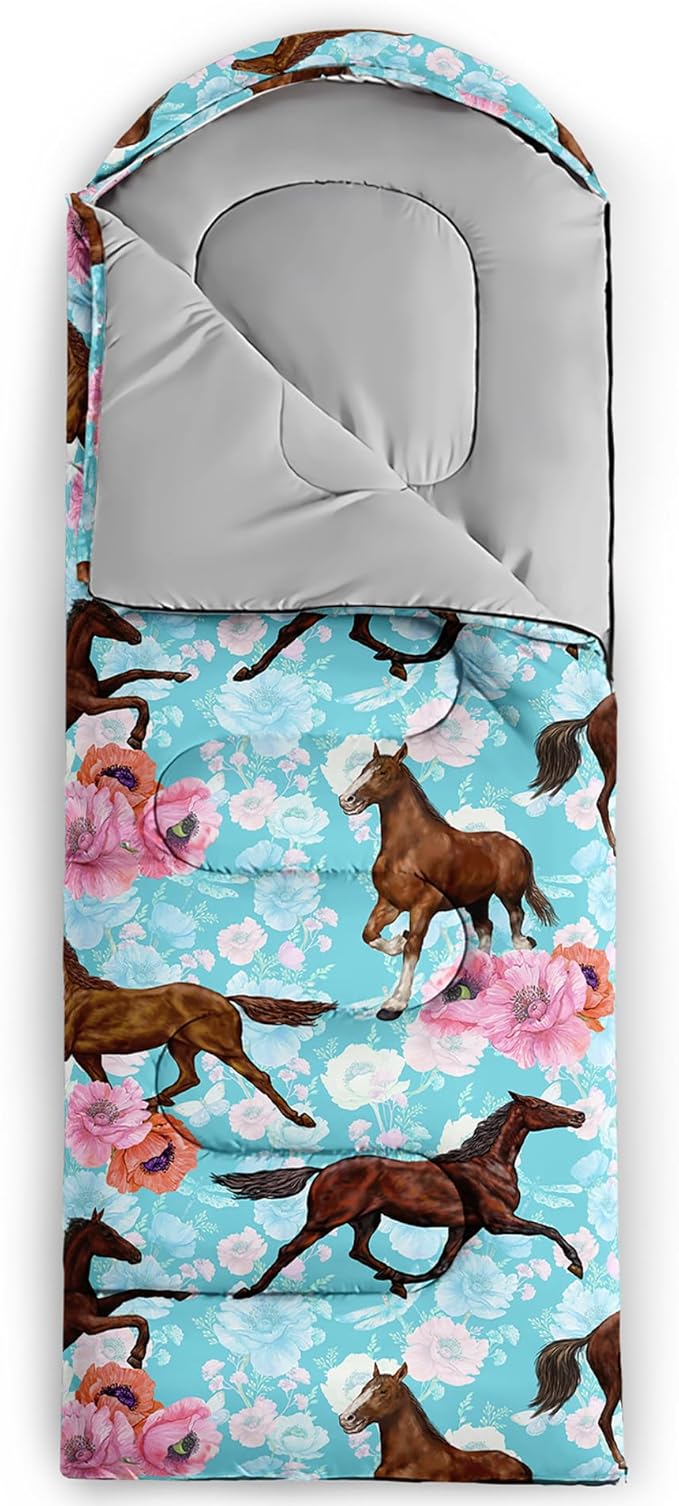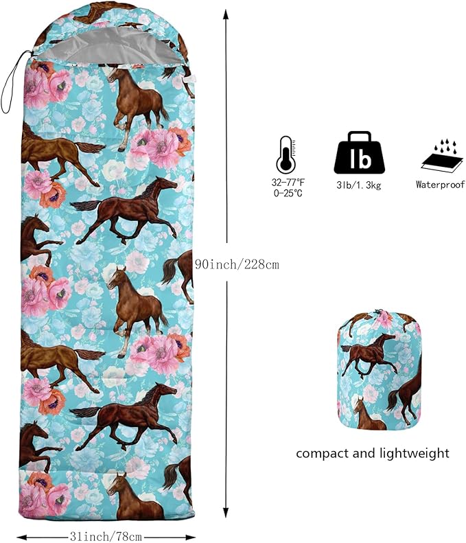 • 【Fits For 3 Seasons】: Size - 31 by 90 inches (W x D). Our Horses sleeping bag can be used in 3 seasons with a design temperature of 32℉-77℉(0℃-25℃). These Sleeping bags also have a weather resistant waterproof design to keep you warm and prevent you from any dampness.