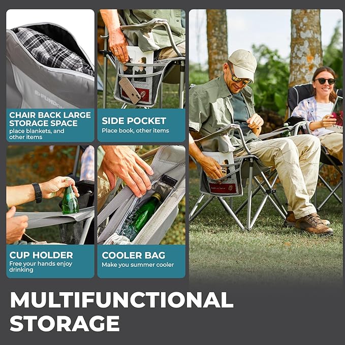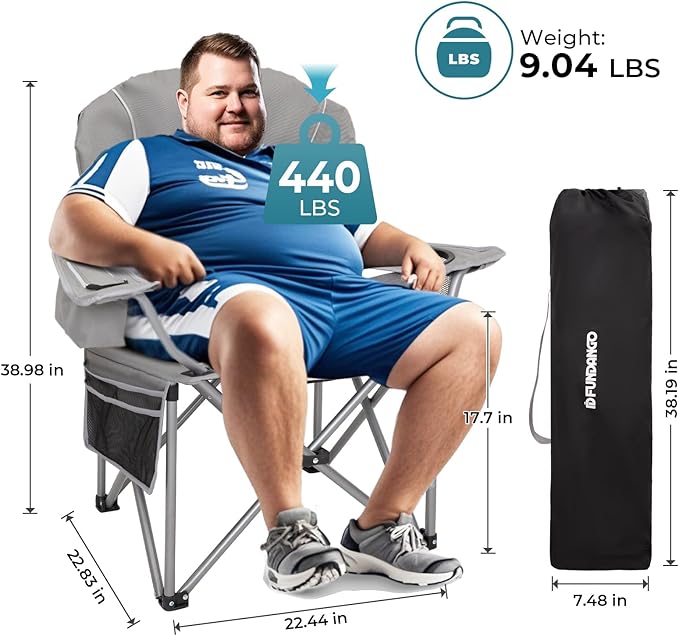 FUNDANGO Folding Camping Chair Heavy Duty, Oversized 440 Lbs Support Outdoor Camp Chairs with Lumbar Support & Cooler Pocket for Fishing Backyard Sports Beach Garden (Grey)