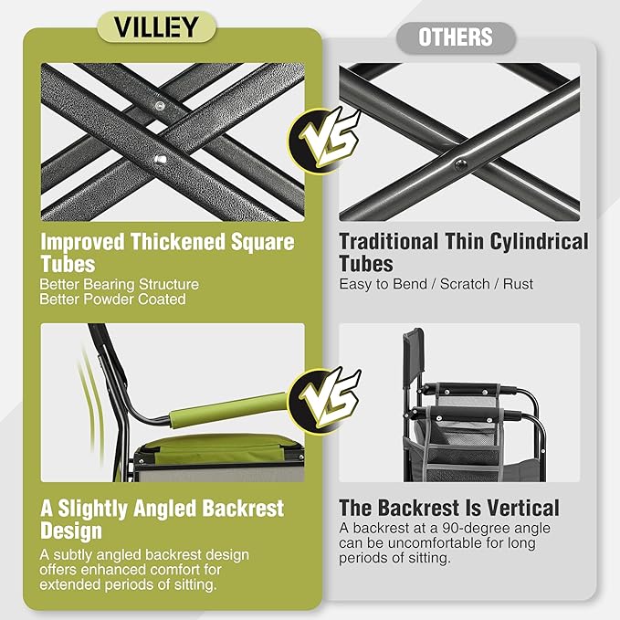 • MULTI-PURPOSE - Whether you're a director, makeup artist, or enjoying camping, a lawn, picnic, tailgating, beach, or sports games, VILLEY portable camping director's chairs always meet your needs