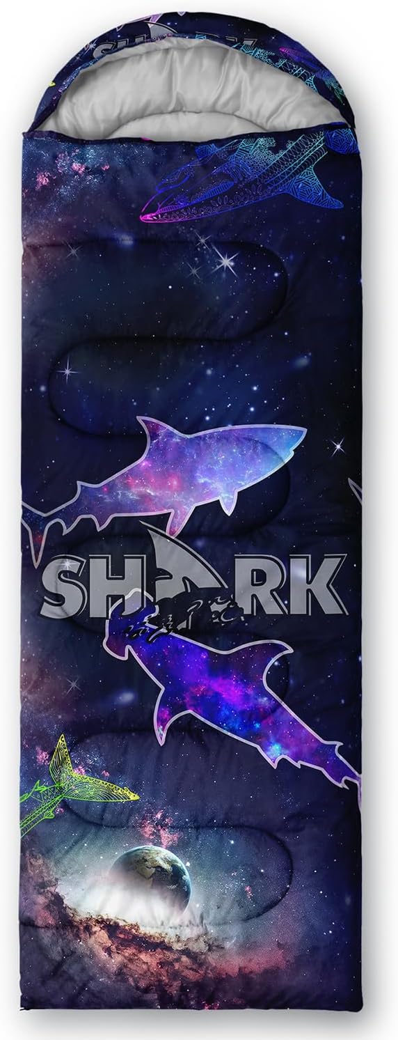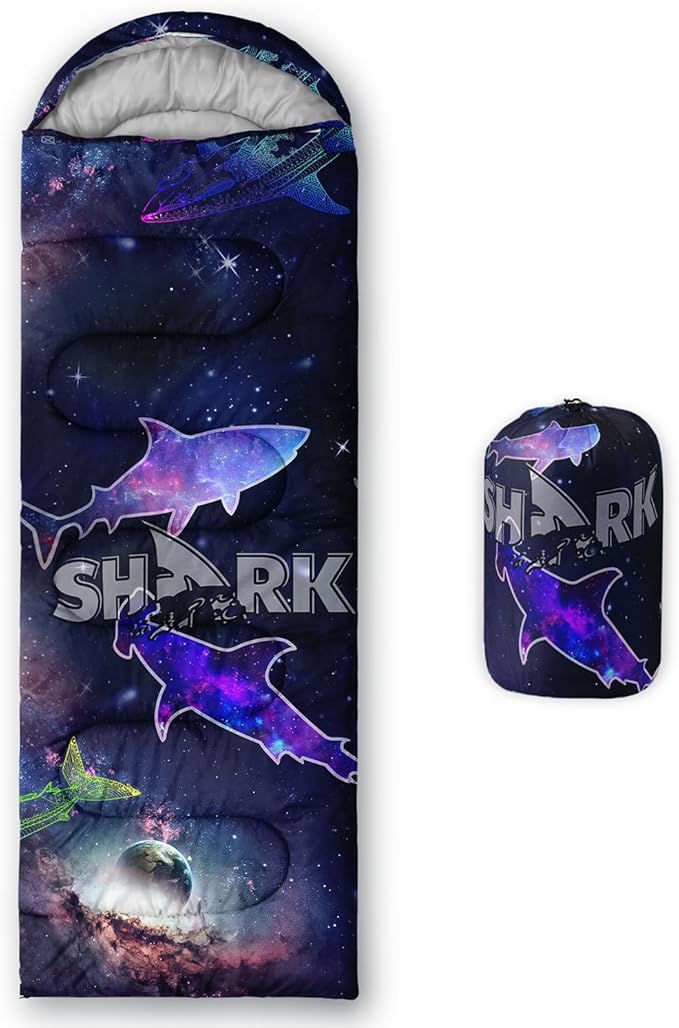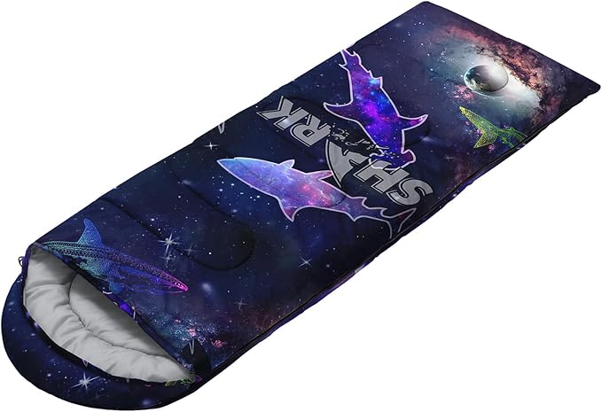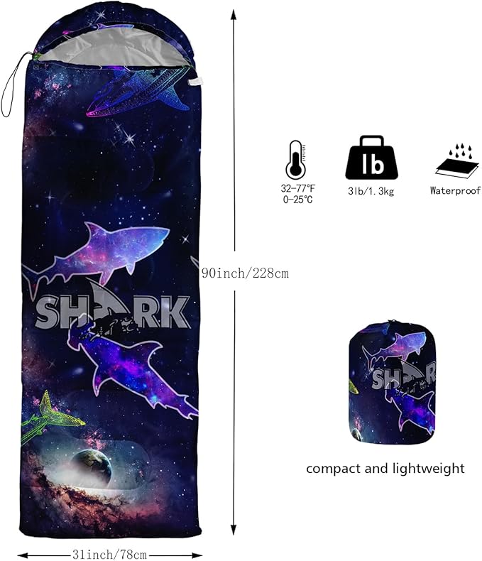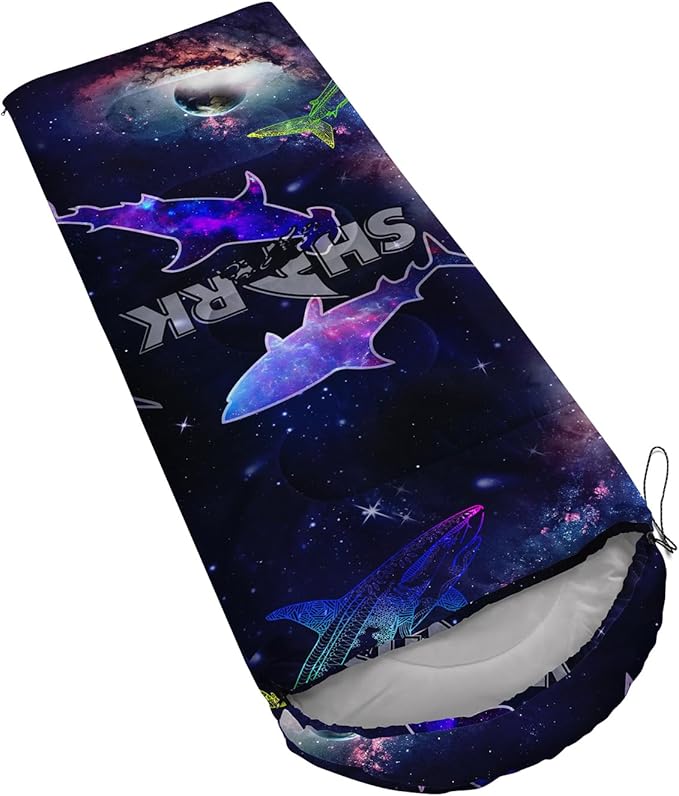 • Starry Sky Shark Purple sleeping bags For All Seasons- Our camping sleeping bags are designed to give you a good night's sleep. Ideal for spring,summer,fall,and winter,rated from 32°F to 77°F (optimal comfort temperature is 50°F to 65°F). Stay comfortable and warm in any condition at normal altitude. Can be used for any outdoor adventure,class camping,summer camps,couch surfing,indoor blanket,and as an emergency blanket for vehicles.